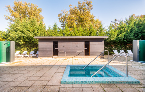 Kiúszón keresztül a fürdőcsarnokból is megközelíthető, masszázs, pezsgő és nyakzuhany élményelemekkel (nyitva a 05.01-09.30 közötti időszakban).